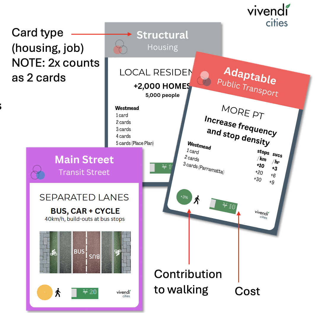 The card game includes a range of options that planners can choose from to make a precinct more or less walkable. But there are tradeoffs! Some options cost more, some increase housing or jobs but reduce walkability, and others result in more traffic.